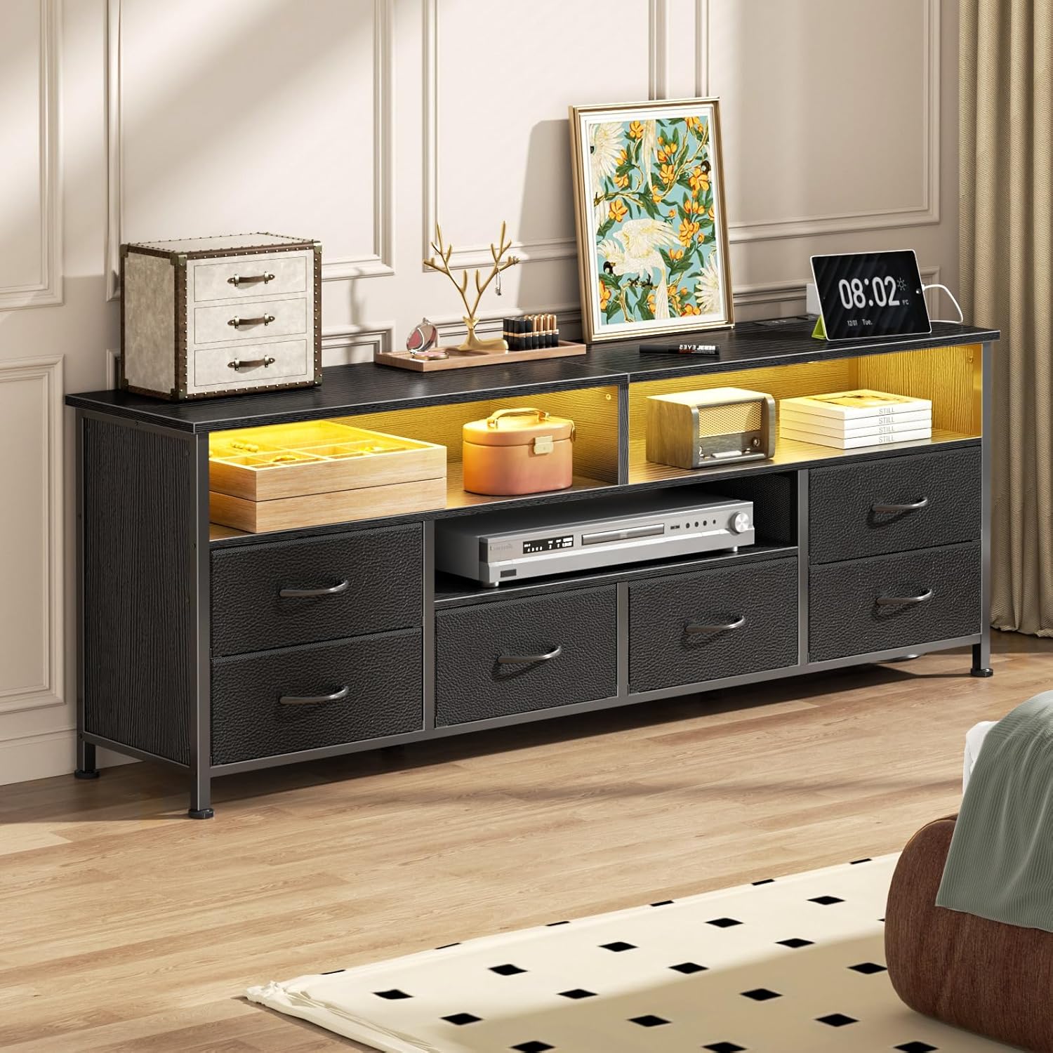 - [6 Drawers TV Dresser] This dresser tv stand with 6 fabric drawers which have 2 different sizes to meet your classified storage needs. Black PU leather surface dresser drawers, lightweight and breathable, easy to move, suitable for storage CDs, records, remote control, also clothes.
