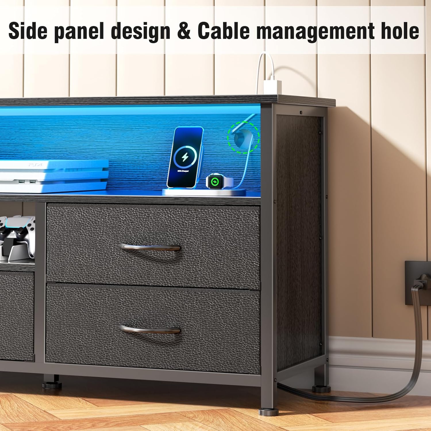 - [TV Stands with Charging Station] 55 Inch tv table built in 2 power sockets and 2 USB charging ports. It is helpful you convenient and efficient use for the use of your electronic devices, ranging from TV boxes, game consoles, media speakers. Additional cable management system avoid messy wires and keep the room tidy.