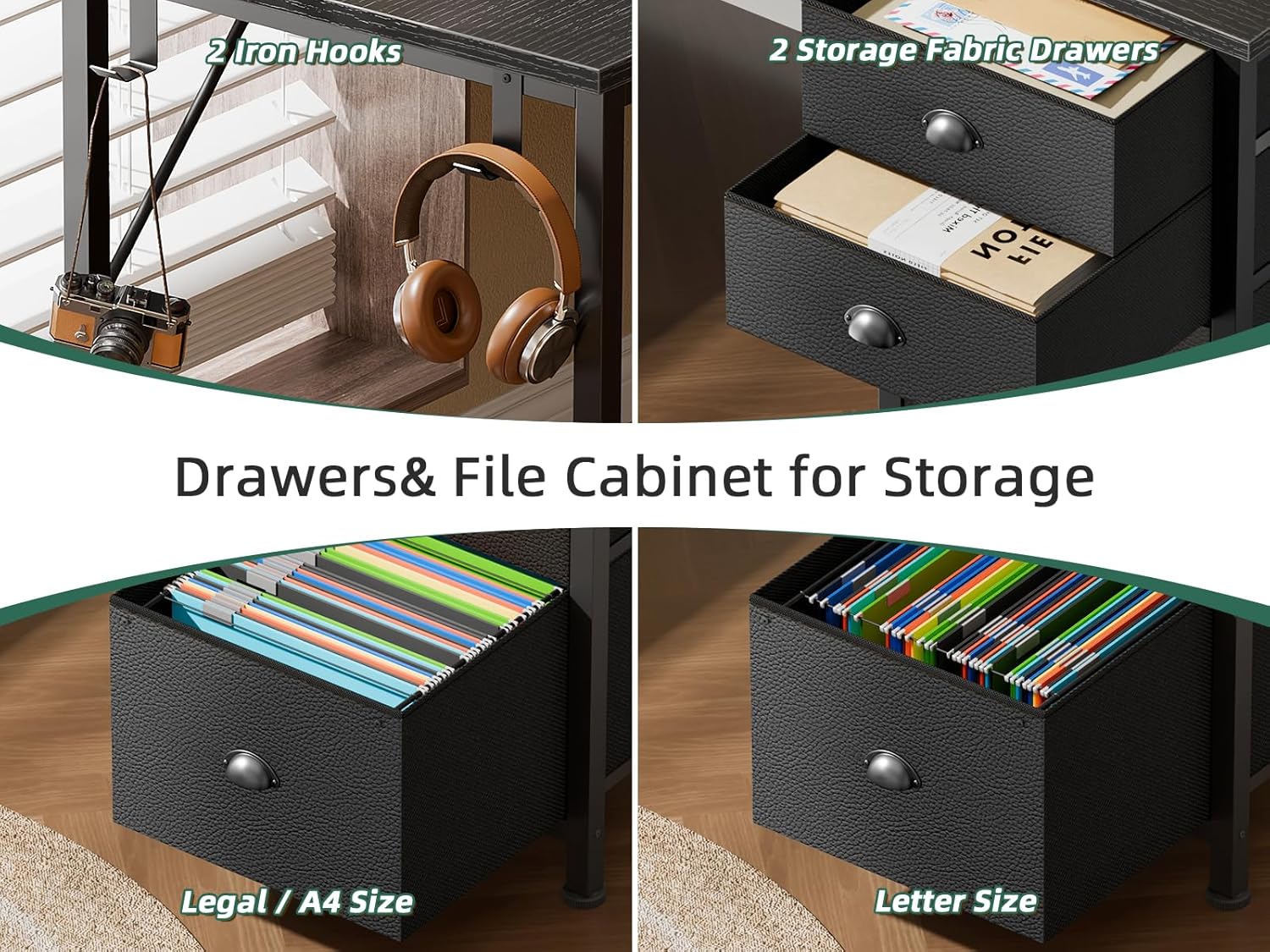 - File Cabinet & Storage Solutions: This L-shaped desk computer setup features a spacious file cabinet for letter, legal, and A4 files, plus two fabric drawers for organized storage. With hooks for headphones or accessories, this gaming desk l shape with storage keeps your home office desk clutter-free and efficient